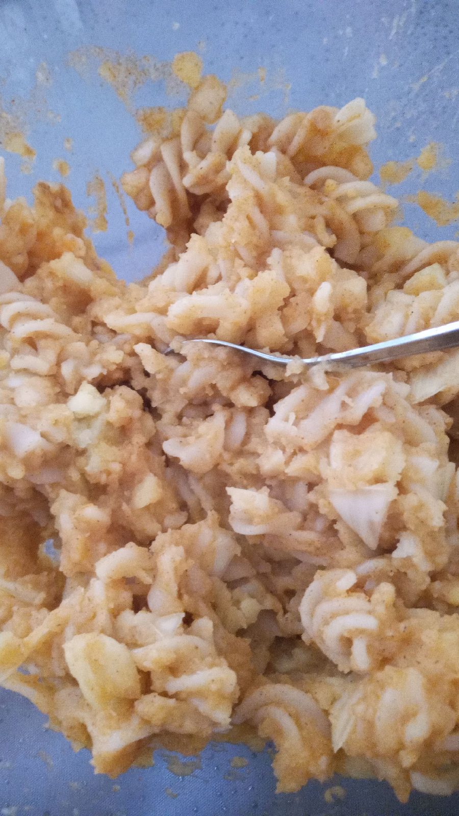 Postup: Uvařené brambory rozšťoucháme s cibulí, v jiném hrnci uvaříme těstoviny. V kastrolu mezitím rozehřejeme sádlo, přidáme koření a poté přilijeme asi deci vody z uvařených těstovin.