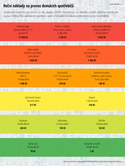 Naopak vcelku nízké náklady jsou za každodenní používání notebooku a zejména pak nabíječky k mobilnímu telefonu, která ročně odebere energii jen za zhruba 3 Kč.