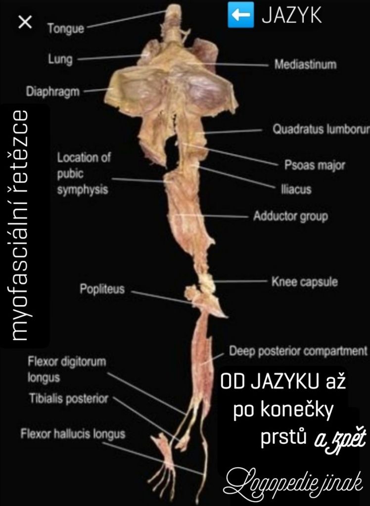 Za tu dobu vím, že dobrá diagnostika začíná už „ve dveřích“, že je potřeba vnímat celé tělo, duši a nakonec i ty mluvidla. Logopedie vážně není jen o hláskách, které pusa nějak vyslovuje. Dnes se vám pokusím víc přiblížit to „tělesno“ ve vztahu k logopedii. Dlouho jsem nevěděla, jak vám to propojení srozumitelně popsat. Včera ve mně už poněkolikáté bouchly saze. Povedlo se? Dejte mi zpětnou vazbu. Na obrázku leží lidské TĚLO, teda spíše jeho část…OD JAZYKU AŽ PO KONEČKY PRSTŮ. Všimněte si součástí jakého KOMPLEXU jazyk je. V našich končinách mluvíme o FUNKČNÍCH LINIÍCH nebo také o svalovém a fasciálním (myofasciálním) ŘETĚZENÍ. Rovnováha a vyvážené svalové napětí jsou klíčové pro kvalitu jakékoliv funkce spojené s pohybem. Naše tělo má těchto funkčních řetězců hned několik (povrchová, boční, linie paže…). Mě zaujala ten, jehož vrcholem je právě JAZYK. Vysvětluju si ho jako PARŤÁKA naší KOSTRY, jako „vnitřní síť – PAVUČINU“, která „drží pohromadě“ ale zároveň také odděluje a ochraňuje naše svalstvo a měkké tkáně a umožňuje nám se HÝBAT. Tato vnitřní síť sestává z FASCIÍ – měkkých částí vazivové tkáně. OBALUJE všechny části lidského těla. Každý sval, každý orgán, mozek i oči mají vlastní ochranný fasciální obal. Zní to moc složitě? PŘEDSTAVTE SI tělo jako LANOVÝ MOST pokud jeho dřevěná konstrukce bude naše kostra, pak tkáně myofasciálního řetězce budou jako SÍŤ napínacích a spojovacích lan. Její vzájemné stlačování a napínání dává hlubokou STABILITU dřevěné konstrukci = naší kostře. Pokud tato síť lan dobře funguje, tak dokáže po celém mostě (těle) rovnoměrně rozložit potřebné NAPĚTÍ PRO určitý POHYB, pro určitou posturu. To vše se děje dobře do té doby, než dojde k problémům s REGULACÍ NAPĚTÍ v síti lan = měkkých tkáních řetězce. Když se někde něco moc povolí, musí se to jinde víc utáhnout a naopak. V postižených oblastech se HROMADÍ NAPĚTÍ, dochází k přetěžování celého systému, což postupem času vyústí v konstrukční problémy… POSTURA je proces, při kterém naše centrální nervová soustava vysílá informaci svalům, které se snaží UDRŽET POLOHU NAŠEHO TĚLA ve stále se měnícím prostředí. Postura není jenom stoj na dvou nohách, je součástí sedu, zvednutí hlavy v lehu na břiše, je nutnou součástí chůze a dalších způsobů aktivního pohybu. Nerovnoměrné svalové napětí u vadného držení těla (přetížená oblast bederní páteře a šíje, oslabené břišní a mezilopatkové svaly) se pojí s PŘEDSUNUTÝM DRŽENÍM HLAVY. Co myslíte, JAK může vypadat svalové NAPĚTÍ JAZYKA a jeho POSTAVENÍ v ústech? Mohou RŮST obličej, patro, čelisti a zubní oblouky tak, jak je pro zdravý vývoj žádoucí, když jim CHYBÍ důležitá OPORA? A jak má vypadat ŘEČ ? !