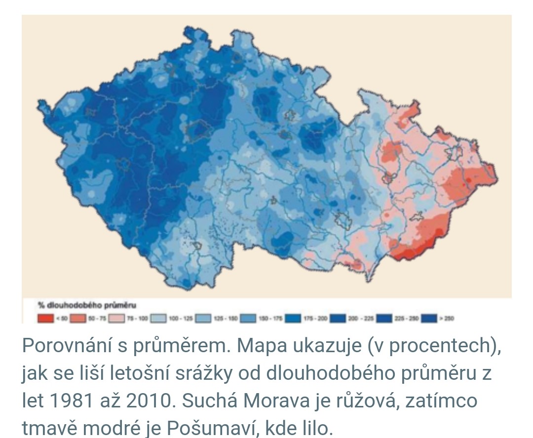 Zato v Čechách byly úhrny výrazně vyšší, než je pro toto letní období běžné. Na mnoha místech spadl dokonce dvojnásobek dlouhodobého průměru z let 1981 až 2010. „Nejvíce srážek v porovnání s minulostí spadlo v okolí Měděnce v Krušných horách, u Stráže nad Ohří v Podkrušnohoří a v okolí Příbrami. Bylo to přes 280 procent dlouhodobého normálu,“ doplnil Vacík.