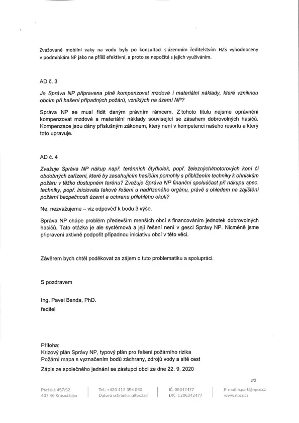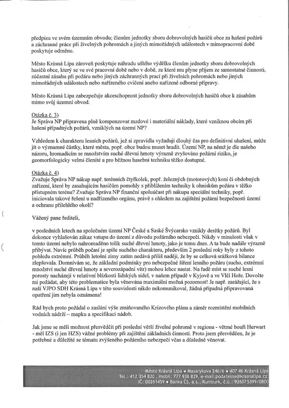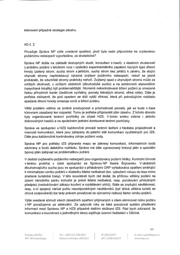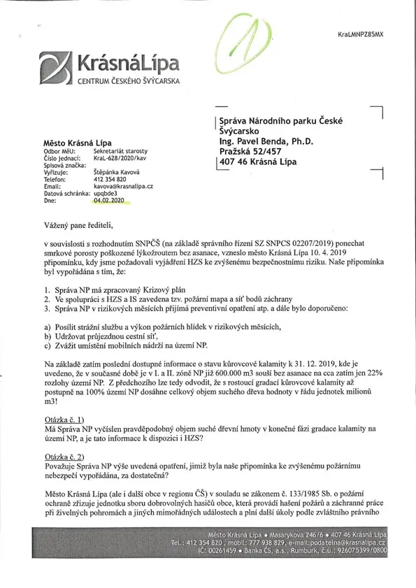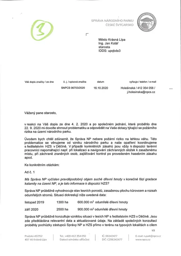 O zvýšeném nebezpečí požáru kvůli suchu a extrémnímu množství suché dřevní hmoty se zmiňuje už první dopis Jana Koláře z února 2020. Podle starosty na tento text, obsahující i kritiku parku kvůli údajné špatné komunikaci, dostalo vedení Krásné Lípy odpověď až po osmi měsících, v říjnu 2020.