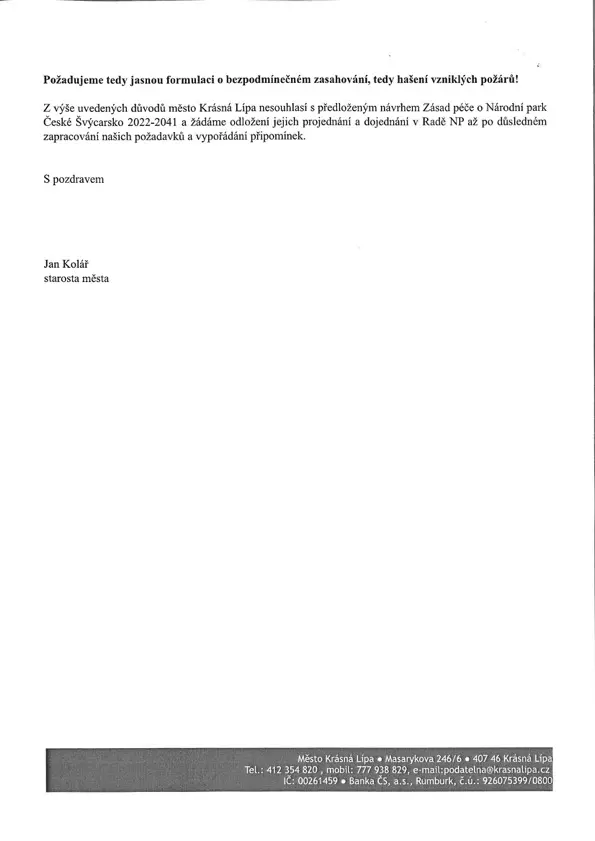 V textu upozorňuje, že v parku leží až 2 miliony kubíků suché dřevní hmoty – nevytěženého dřeva z kůrovcové kalamity. „Jsme přesvědčeni, že je zásadním ohrožením zdraví osob a majetku, připouštět možnost kontrolovaného požáru,“ varoval starosta Kolář, že se případný požár může stát nezvladatelným.