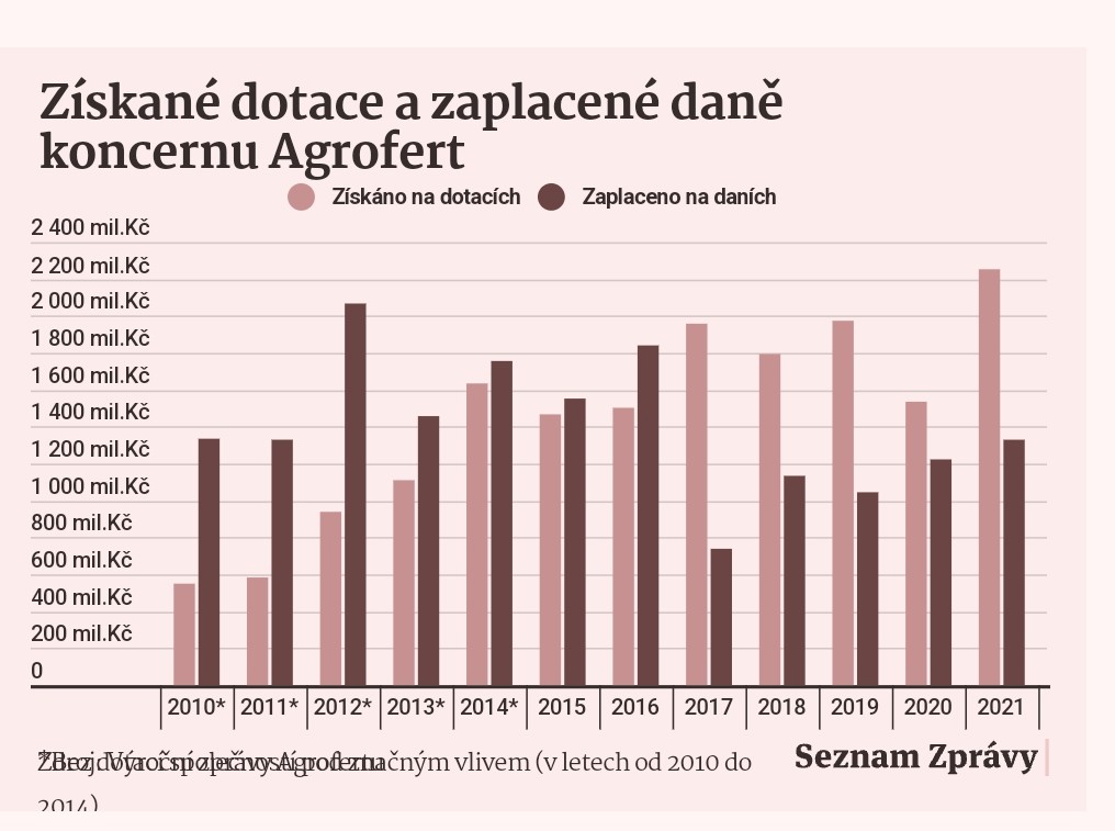 Posledních pět let pak Agrofert pravidelně získává více peněz z dotací, než kolik odvede na daních. Podle dat z výročních zpráv koncern odvedl státu na dani z příjmu za poslední roky nejméně v roce 2017, a to necelých 739 milionů korun, zatímco příjmy z dotací atakovaly hranici dvou miliard.