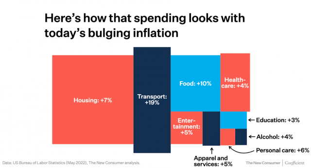 Na omluvu: je těžké si všimnout něčeho, co se vás netýká, ilustruje Dan Frommer v reportu The New Consumer dopady inflace na různé příjmové skupiny. Ti, co mají našetřeno, dopady nevnímají.