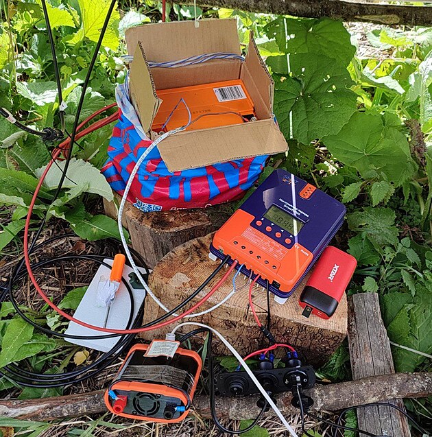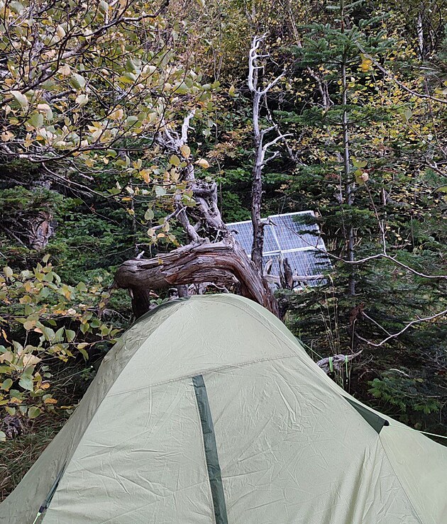V lese si postavil dva stany. První na slunečném a závětrném místě, kde spí. Druhý, pracovní stan vztyčil asi tři minuty chůze opodál na kopci, kde chytá mobilní signál. Lepší připojení v jeho lesní kanceláři zajišťuje anténa zavěšená na borovici.