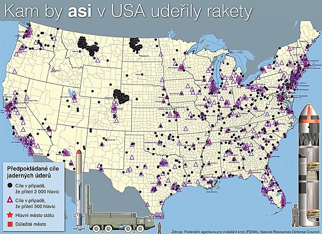Totéž by ale potkalo kalifornské pobřeží a centra ve vnitrozemí. V případě velké výměny by zvlášť velký chumel střel letěl na prázdné státy, jako je Montana a Severní Dakota, a na prérie mezi Wyomingem a Nebraskou. Tam jsou totiž hlavní odpalovací sila amerických mezikontinetálních střel.