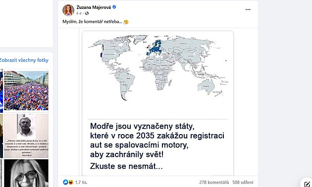 V příspěvku publikovaném političkou na Facebooku je na mapě názorně vyznačeno, že odklon od spalovacích motorů řeší pouze Evropa, Kalifornie a aby se neřeklo, tak kousek Chile a ždibíček Kanady. Co si mají z takového příspěvku odnést jeho příjemci, je jasné: „Vidíte, měli jste pravdu, Green Deal je zbytečný, naše omezování je plivnutí v moři, velké země s tím nic nedělají.“