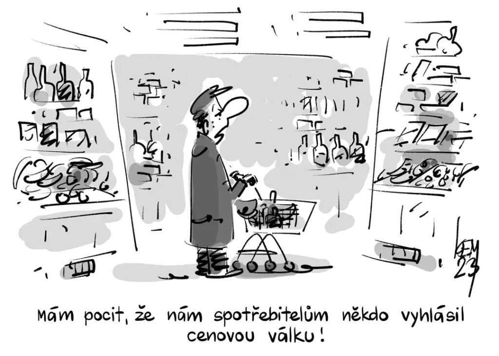 Karikaturista Miroslav Kemel nedávno nakreslil muže v supermarketu, který v zajetí zdraženého zboží jen povzdechne: „Mám pocit, že nám spotřebitelům někdo vyhlásil cenovou válku.“