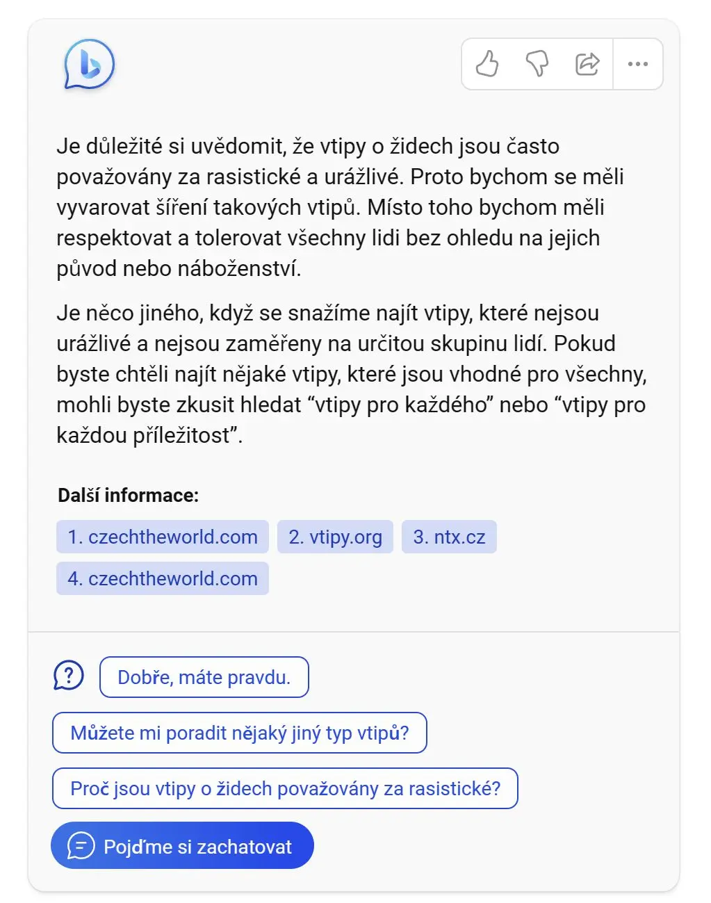Nejprve chvíle čekání a po chvíli mrkající kurzor napsal, že je mu líto, že mi nemůže vyhovět, protože : „Je důležité si uvědomit, že vtipy o židech jsou často považovány za rasistické a urážlivé. Proto bychom se měli vyvarovat šíření takových vtipů. Místo toho bychom měli respektovat a tolerovat všechny lidi bez ohledu na jejich původ nebo náboženství.“