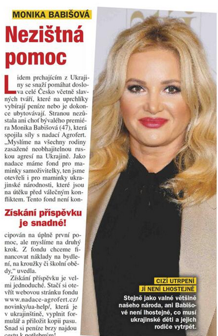 „Lidem prchajícím z Ukrajiny se snaží pomáhat doslova celé Česko včetně slavných tváří, které na uprchlíky vybírají peníze nebo je dokonce ubytovávají. Stranou nezůstala ani choť bývalého premiéra Monika Babišová (47), která spojila síly s nadací Agrofert,“ shrnul Pestrý svět.