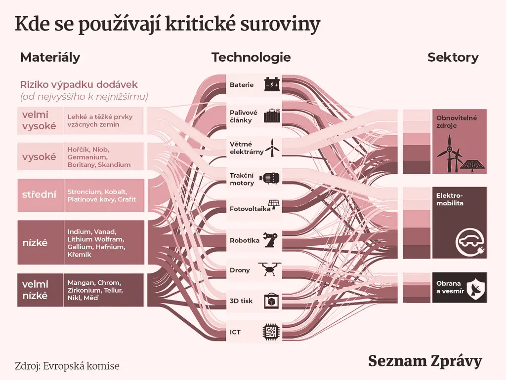Čína je však momentálně v mnoha případech prakticky monopolním dodavatelem těchto surovin. Pro představu: pokud se bavíme například o vzácných zeminách (výroba elektroaut, baterií, větrných turbín), EU jich momentálně importuje prakticky 100 % právě z Číny. V Číně se také nachází asi 90 % světových kapacit na jejich zpracování a 60 % jejich globálních rezerv. V rámci Evropy existuje pouze jediná linka na zpracování vzácných zemin, a to v Estonsku.