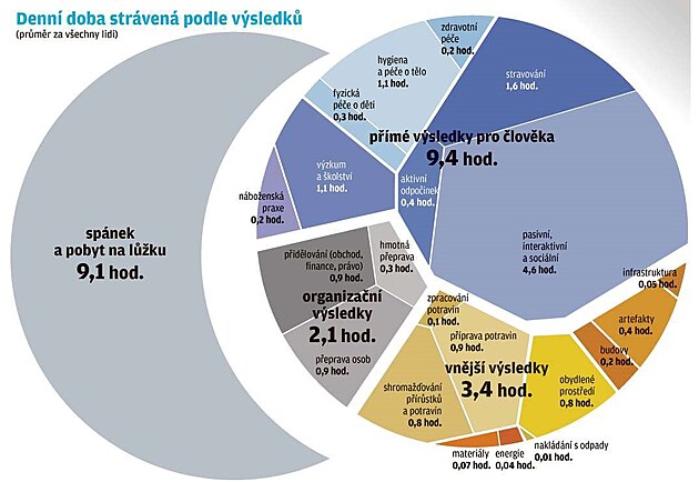 Ve zbývajících šesti hodinách se průměrný obyvatel země věnuje produkci potravin a jejich úpravě, dopravě do zaměstnání, cestování a také obchodu, finančnictví, právu, politice a státní správě. Likvidací odpadů strávíme v průměru jednu minutu denně, kdežto péči o své příbytky plných pětačtyřicet minut.