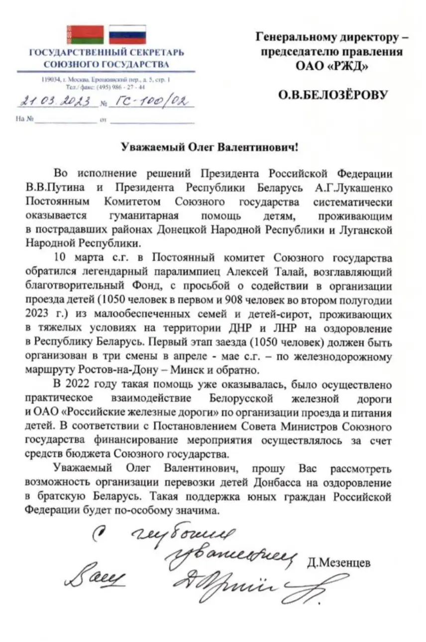 NAU zveřejnilo i dokument, ve kterém Mězencev dává pokyny k usnadnění přesunu ukrajinských dětí, včetně sirotků, na území Běloruska. Písemný dokument získali běloruští „kyberpartyzáni“.