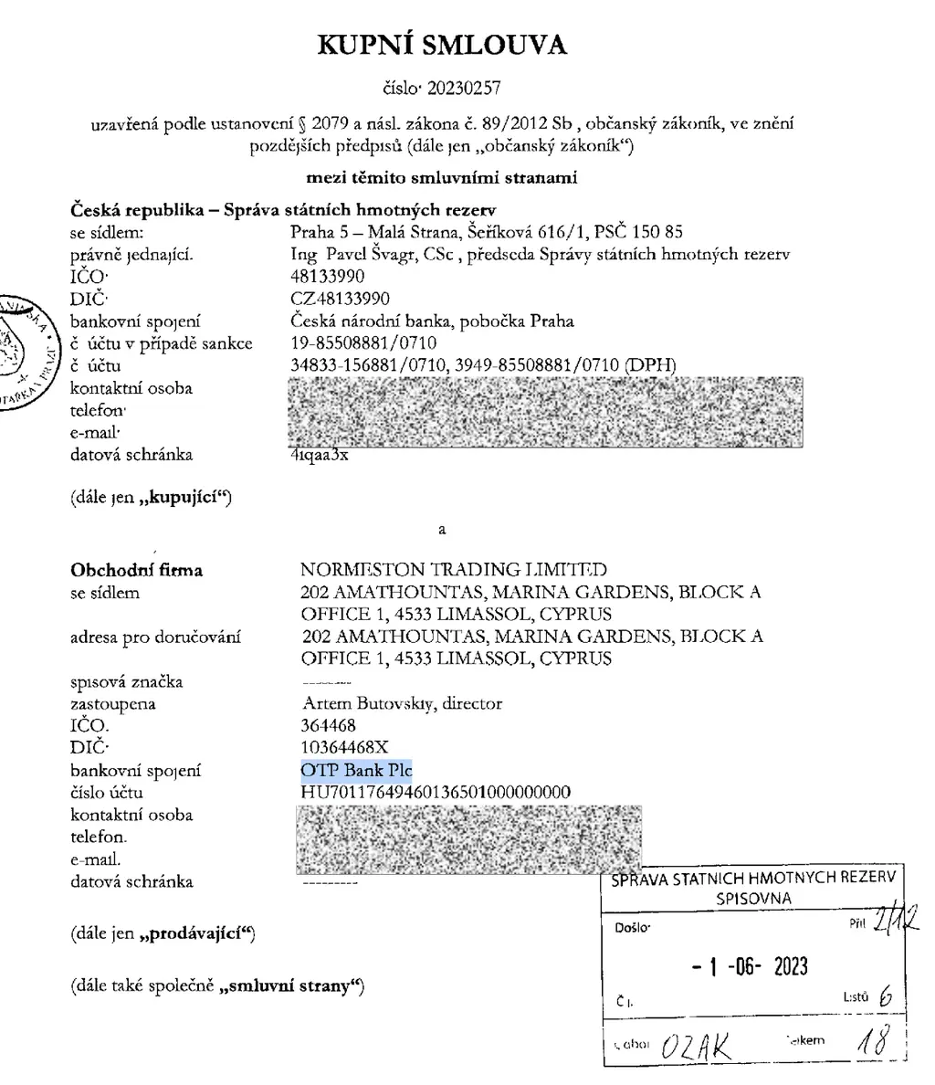 Strategickou surovinu se Česku zavázala dodat společnost Normeston Trading Limited.