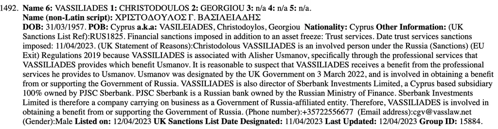 I proto právník Vassiliades skončil na sankčním seznamu Velké Británie, protože poskytuje služby podnikateli Alisherovi Usmanovi označovanému za nejbližšího Putinova oligarchu.