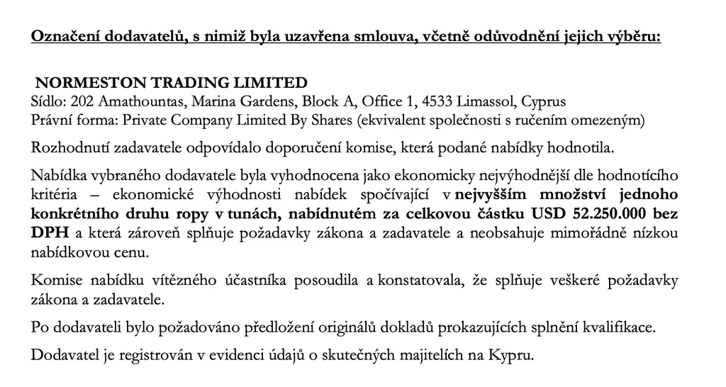 Normeston Trading podle něj napošesté vyhrál, protože nabídl nejnižší cenu. A porazil tak druhého účastníka – Orlen Unipetrol, s nímž stát uzavřel smlouvu na dodávku motorové nafty.