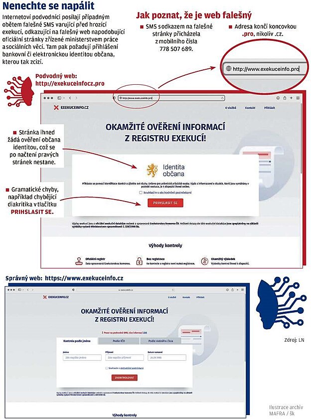 Posledním takovým případem byla podvodníky rozesílaná SMS varující před hrozící exekucí. Přiložený odkaz na web Exekuceinfo.cz spravovaný ministerstvem práce a sociálních věcí však vede na jinou adresu Exekuceinfocz.pro. Tam pak požadují přihlášení bankovní či elektronickou identitou občana, kterou tak zcizí. Podvodem se již zabývá policie.