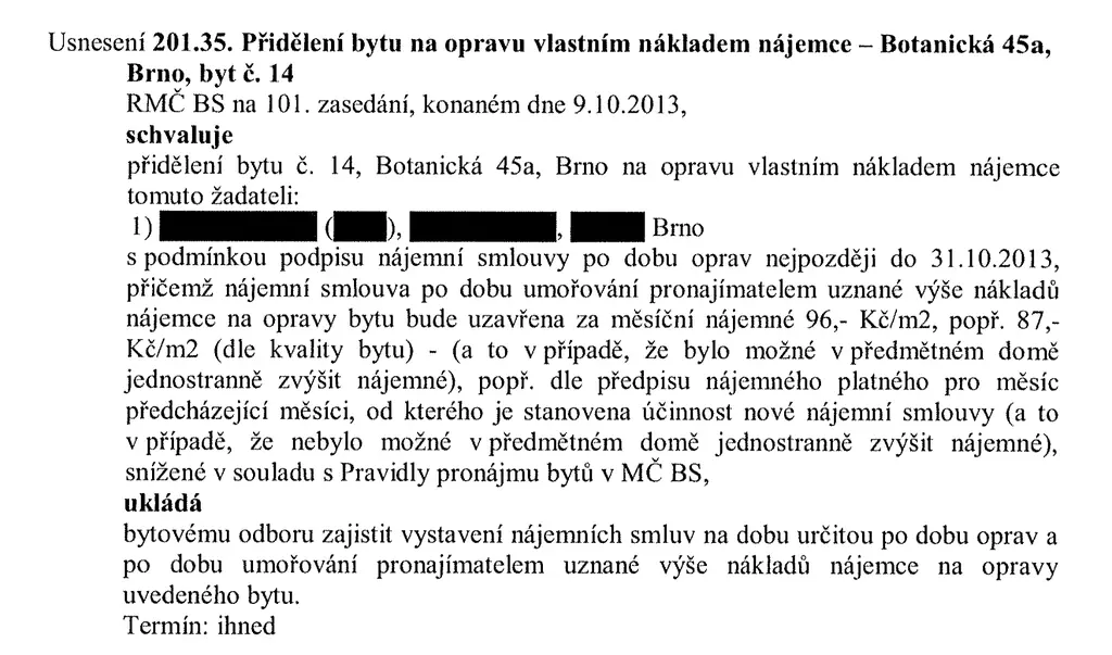 Získanými listinami ale policisté dokládají i to, že skupina měla přístup k interním listinám z radnice Brno-střed. Šlo například o neanonymizované zápisy z rady, které obsahují jména lidí, jimž politici přidělili byty.