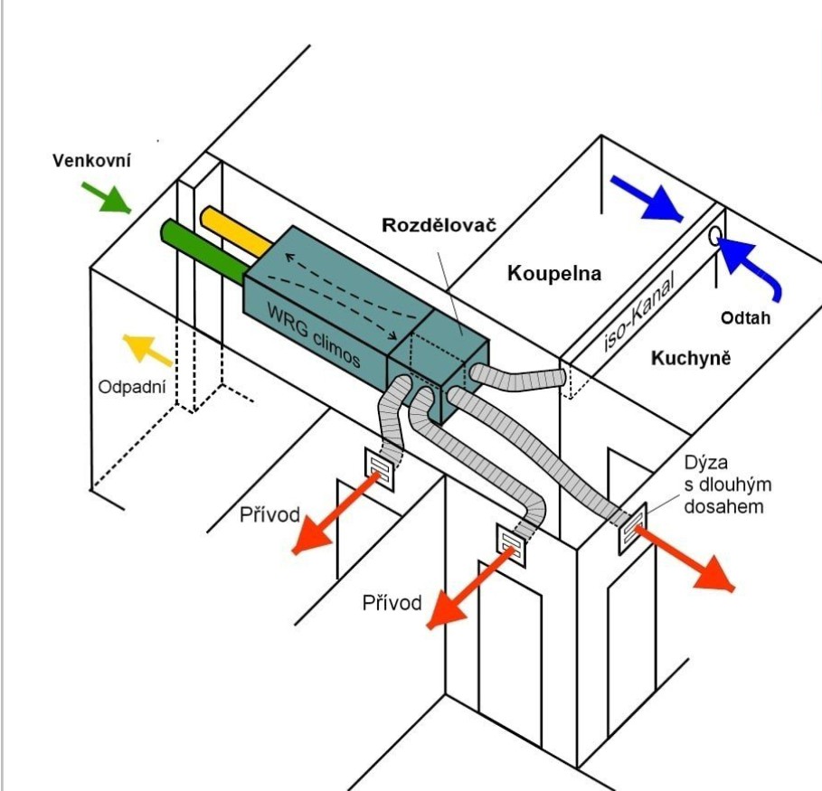 Rekuperace zajišťuje výměnu vnitřního znečištěného vzduchu za čerstvý vzduch zvenku, který ohřívá a pomocí filtrů očišťuje od smogu, prachu, pylu a dalších nečistot a alergenů. Celý systém funguje díky rekuperační jednotce s výměníkem, ze které jsou vedeny vzduchotechnické rozvody do všech místností, které chceme větrat. Pro odvod vnitřního vzduchu slouží jiné rozvody než pro přívod čerstvého venkovního vzduchu, takže nedochází k míchání a kontaminaci. Rekuperace vzduchu funguje v rovnotlaku, tzn. kolik vzduchu odvádí, tolik jej zase přivádí. Množství odváděného vzduchu si na začátku nastavíme sami, stejně jako dobu, po kterou výměna vzduchu probíhá.
