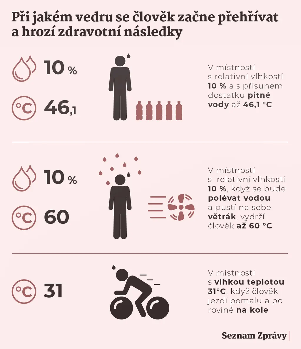 Jak ale ukázaly jiné výzkumy, schopnost lidského těla potýkat se s vedrem prudce klesá s tím, jak stoupá vlhkost. Čím vyšší je vlhkost, tím hůř se z kůže odpařují tekutiny, což znamená, že základní mechanismus ochlazování lidského těla přestává fungovat.