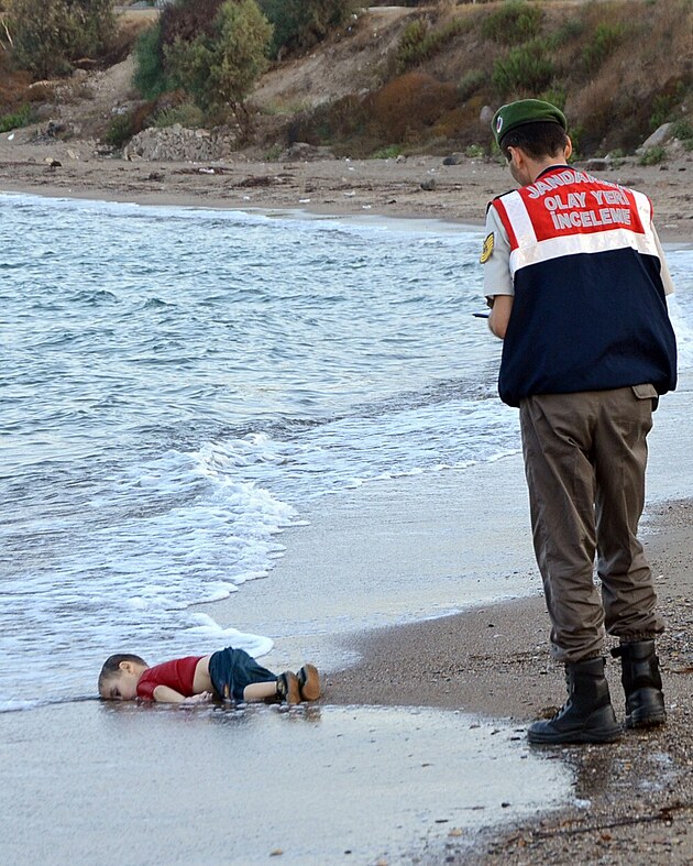 Drobné vlny se líně převalují po tureckém pobřeží. Písčitá pláž. Na ní leží bezvládné tělo dvouletého chlapečka v červeném tričku a šortkách. Má tmavé vlasy, do tváře mu však není téměř vidět.